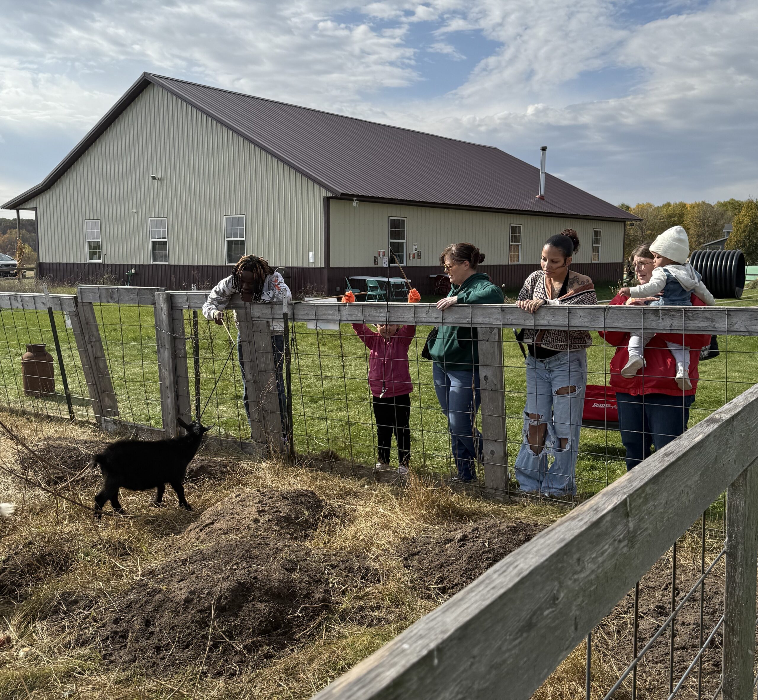 At the Z & G Corn Maze in rural St. Joseph Oct. 18, four family generations enjoy “Goat Fishing,” using lettuce leaves as “bait.” From left to right are Abdullah Abdullah, Trinity Spears, Melissa Roering, Jasmine Spears and Diane Roering, holding her great-grandson Kaymani Spears.