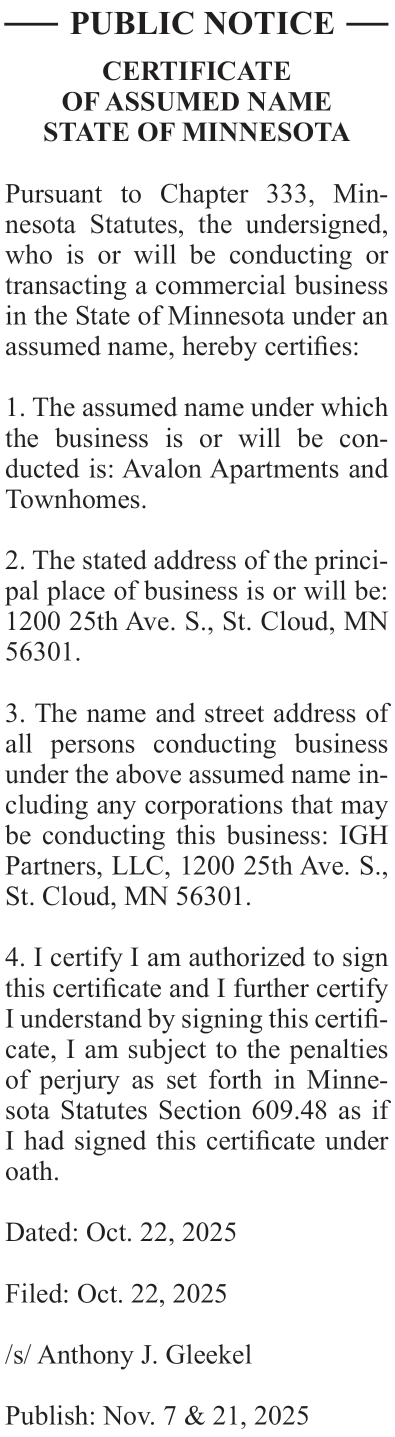 Certificate of assumed name Avalon Apartments and Townhomes