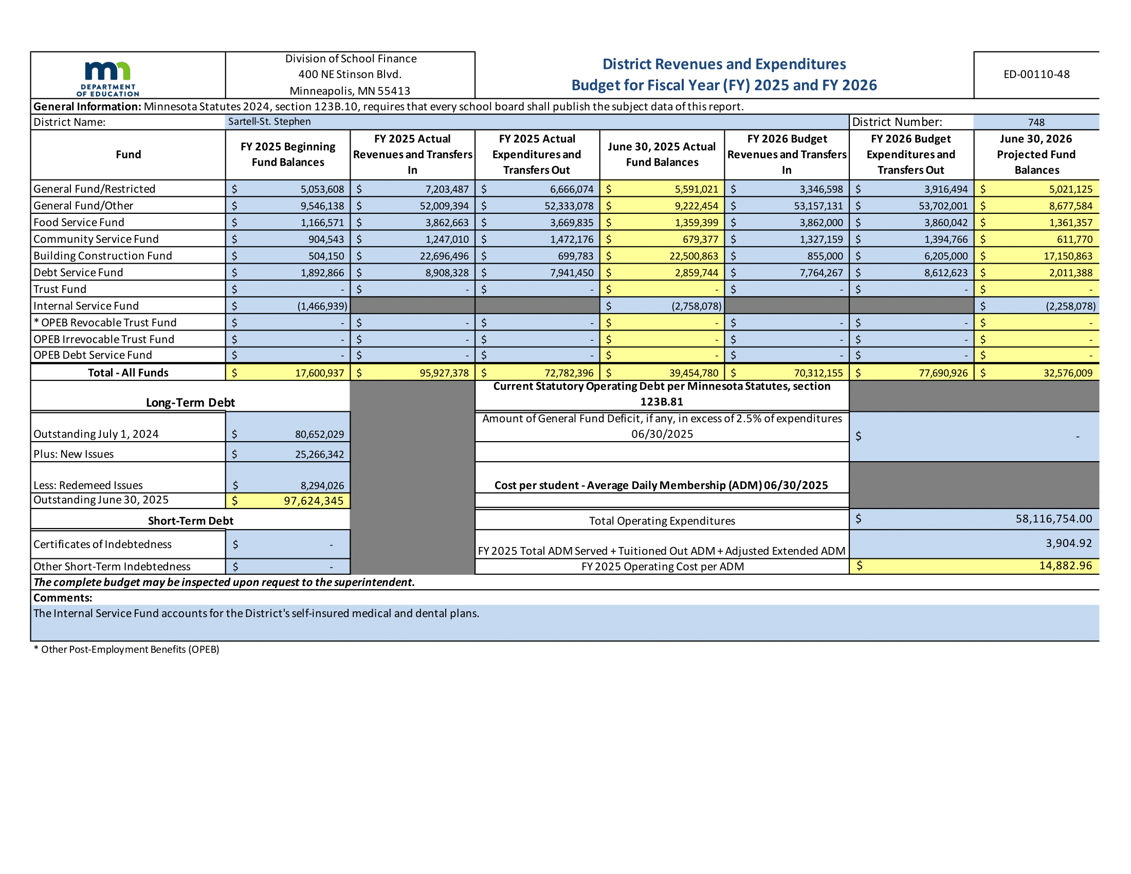 District revenues and expenditures budget for fiscal year 2025 and FY 2026