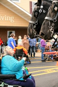 Carol Ann Feltus gives attention to a team of horses on a break from pulling wagons full of people around neighborhoods surrounding Edgewood Assisted Living at the Oct. 16 Fall Festival.