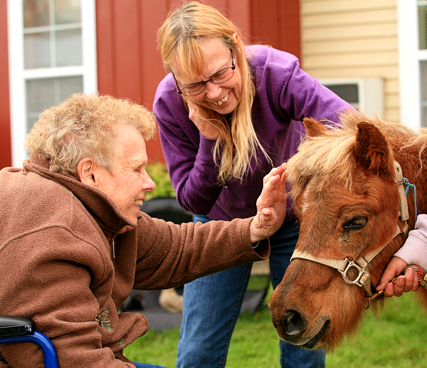 Carol Behrandt (left) pets a pony with daughter Patty Behrandt of Sartell Oct. 16 at the Edgewood Fall Festival. Festivities, which were open to the public, included a petting zoo, horse-drawn wagon rides, live music, pumpkin-painting and fall-themed snacks.