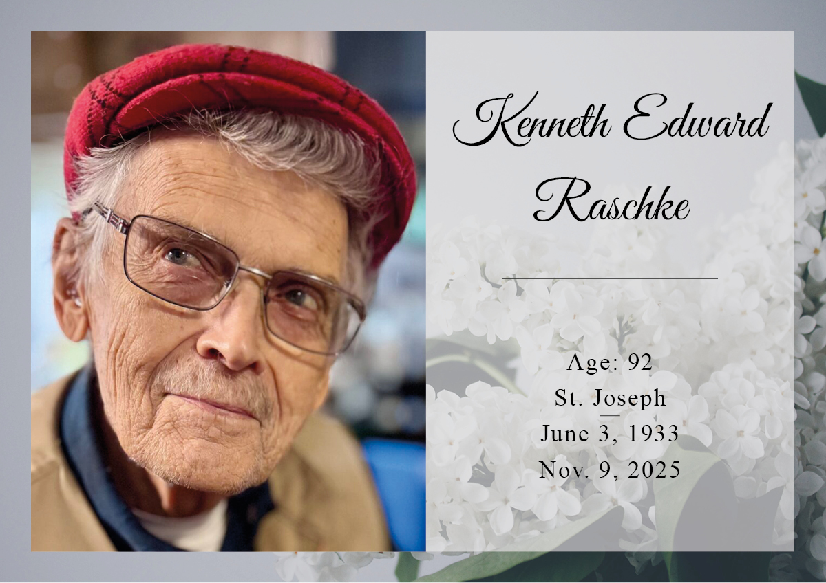 Kenneth Edward Raschke, 92, of St. Joseph, died peacefully on Nov. 9.