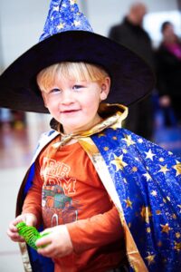 Emmett Ritter, 2, of Holdingford, plays with a slinky he received at the Oct. 25 trick-or-treat event at the Sartell Community Center.